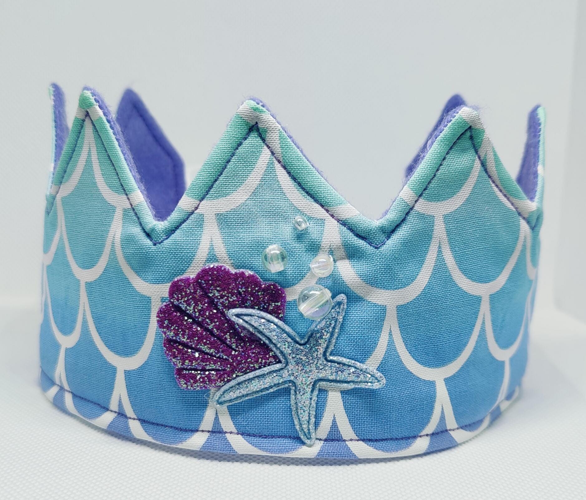 Bring a touch of under-the-sea magic to playtime or parties with this soft, handmade fabric crown. Featuring a shimmering mermaid scale design and sparkly sea-inspired accents, it’s perfect for birthdays, dress-up, or everyday imaginative play.
